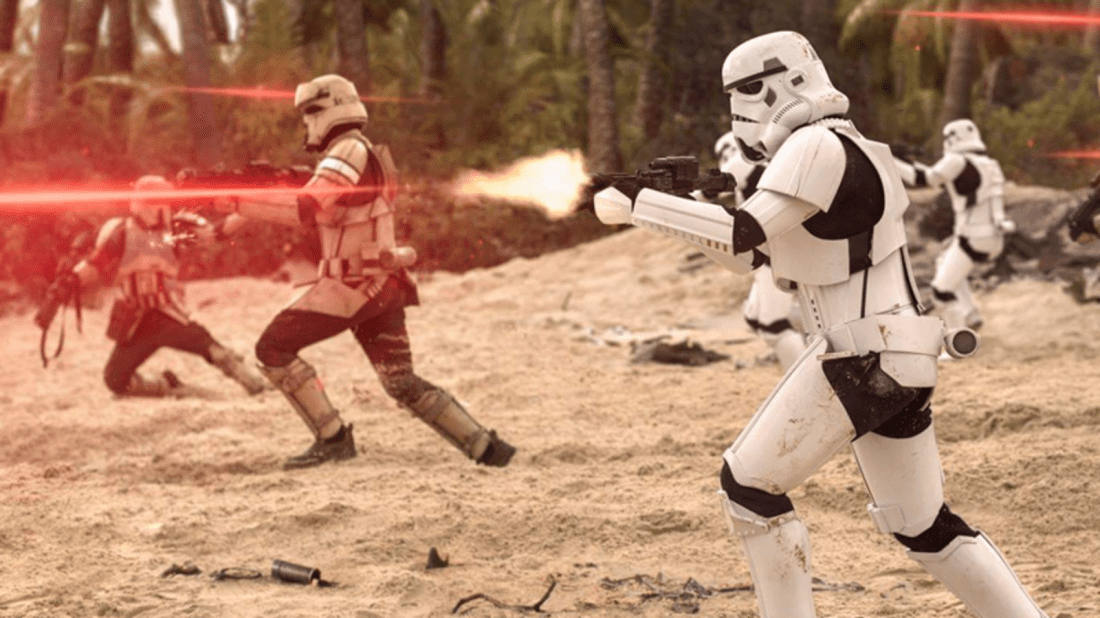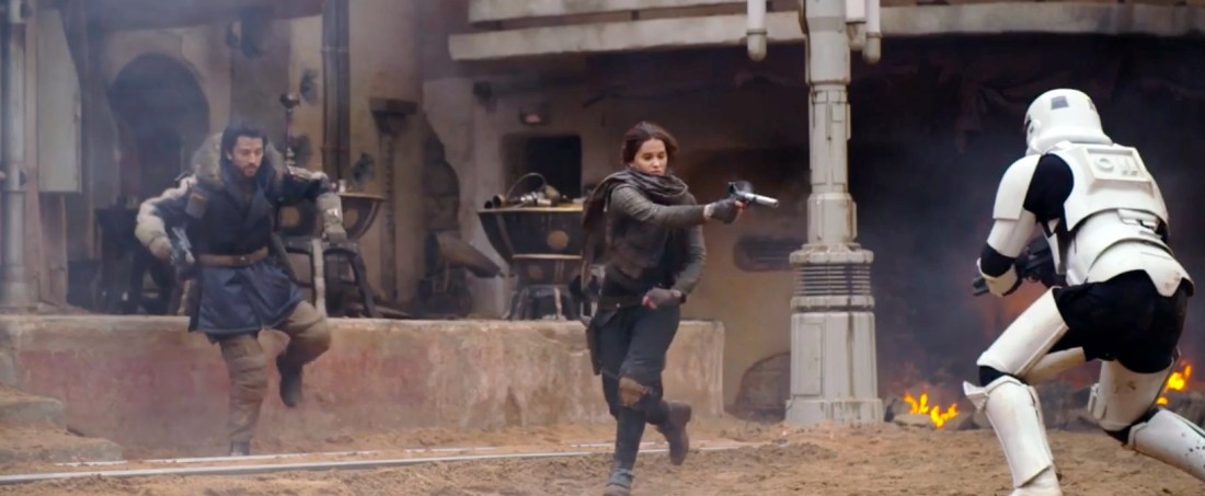 The image below captured during filming shows Jyn Erso firing her A180 blaster pistol at a Stormtrooper.