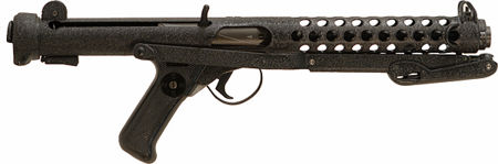 It featured a collapsible and folding stock, as well as a side mounted magazine well to accept a thirty round curved, box magazine.